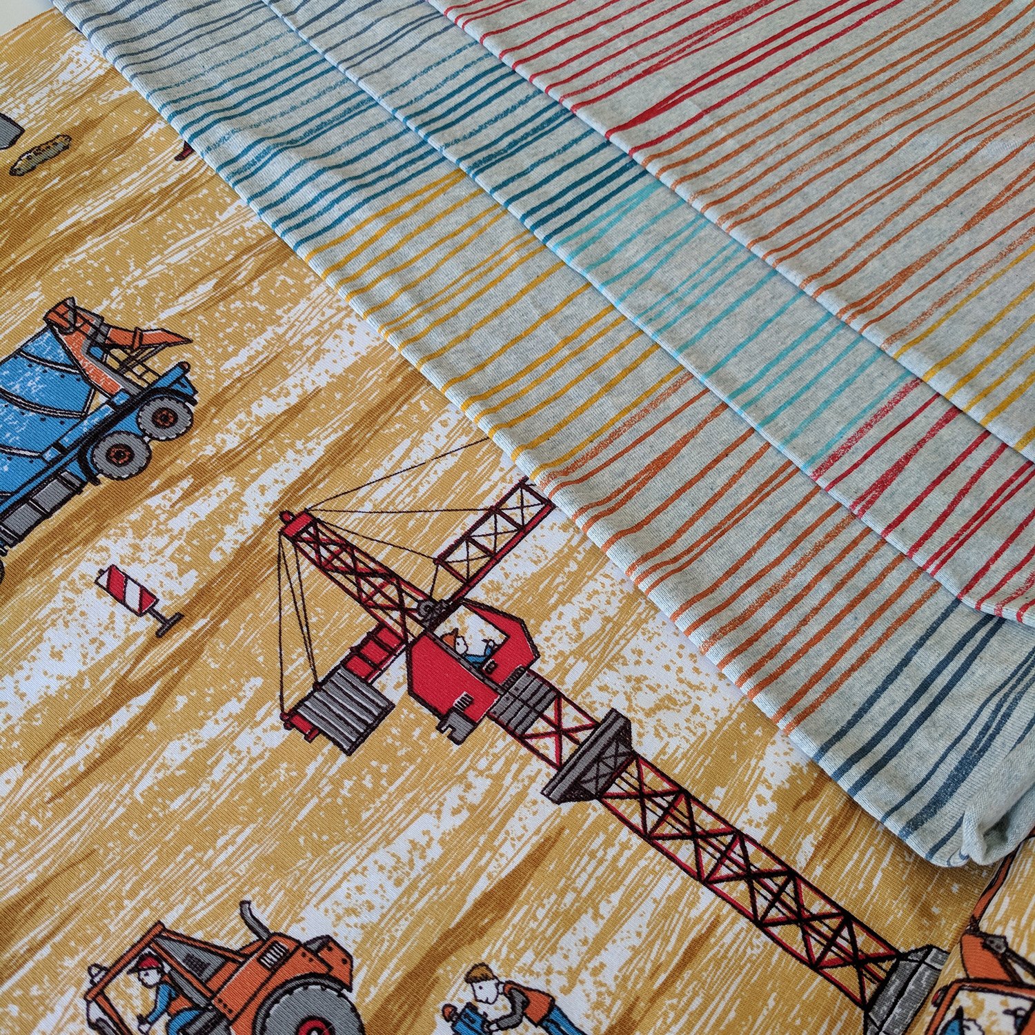Der Stoff „Baustellenfahrzeuge“ ist ein Baumwolljersey (95% Biobaumwolle, 5% Elasthan) und er erscheint ab morgen bei Lillestoff!