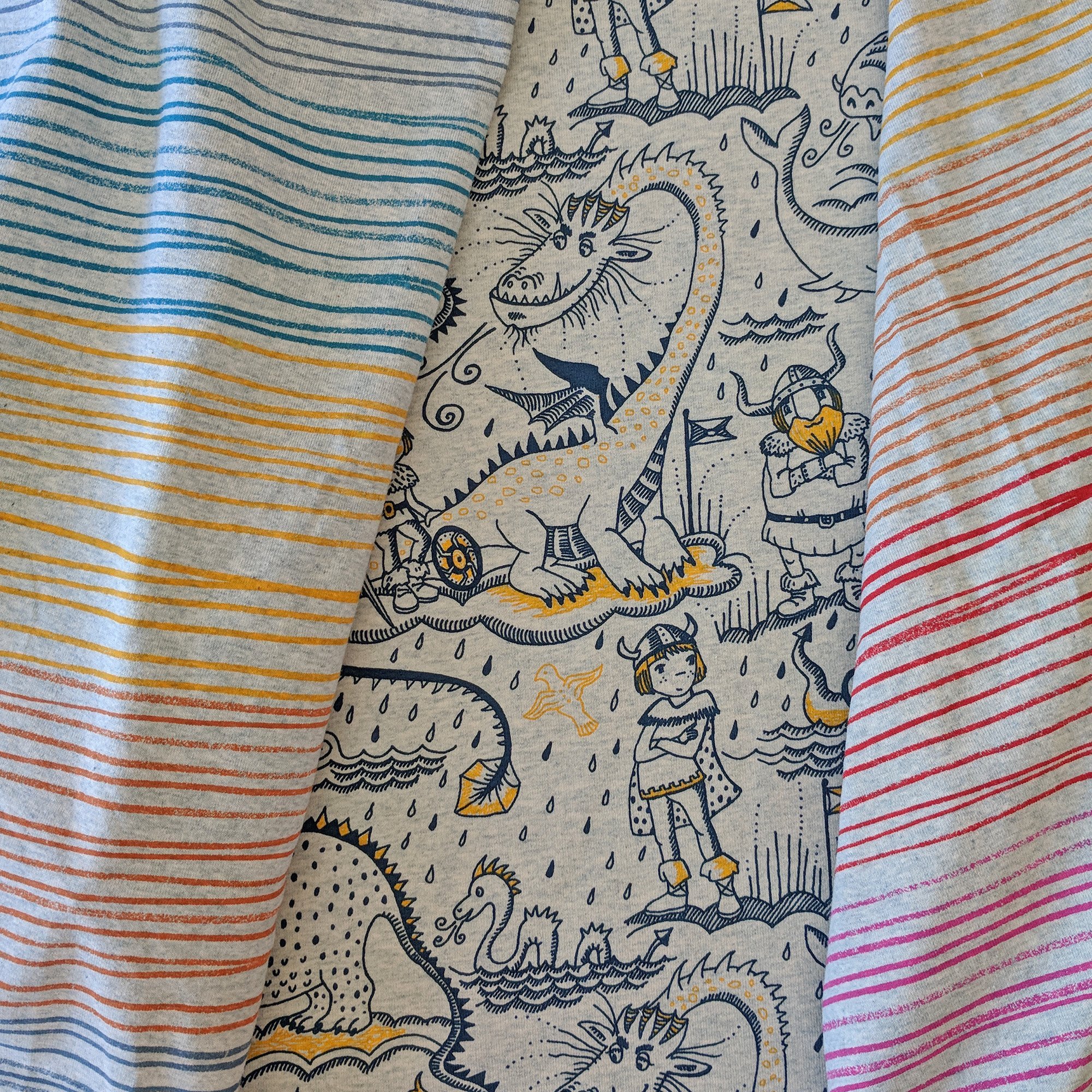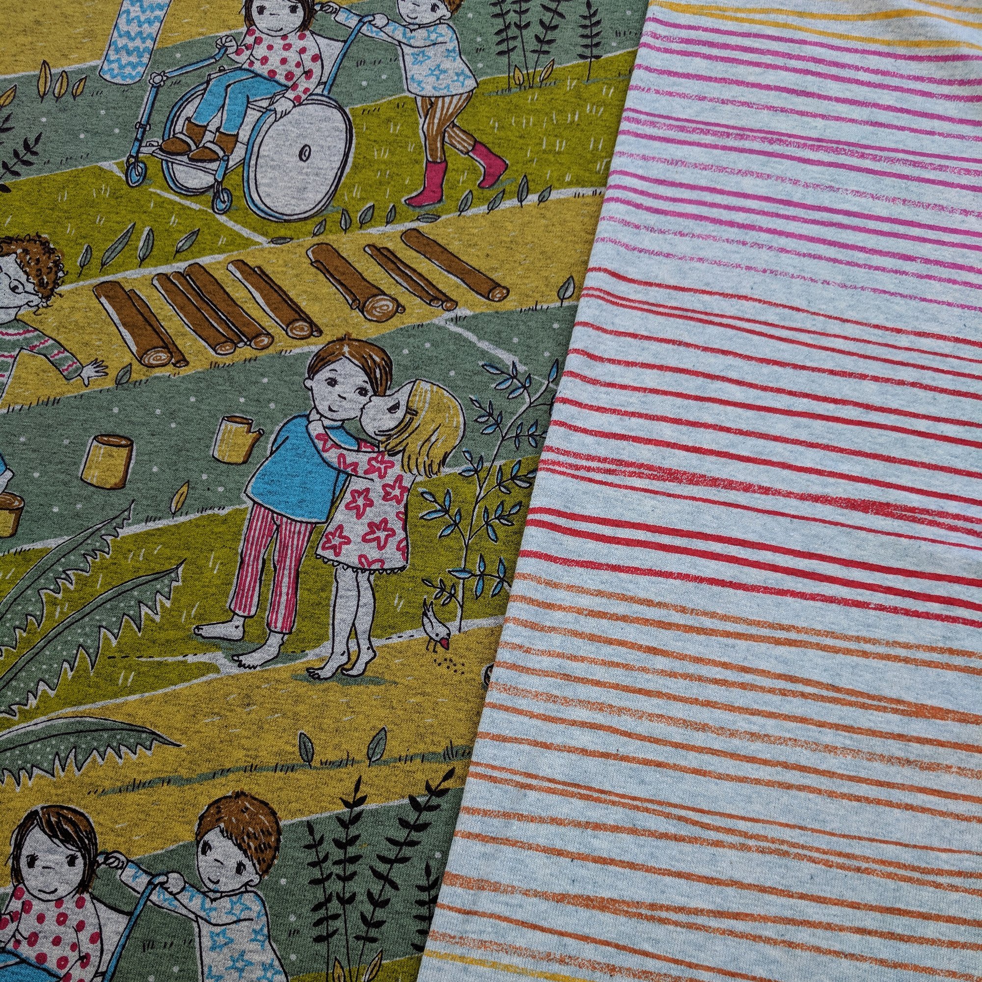 Die „Buntstiftstreifen“ sind zurück! Sie kommen in 4 ganz neuen Farbkombinationen, da wird für jeden etwas dabei sein. Und sie sind echte Kombiwunder, ich zeige euch unten ein paar Beispiele, welche Stoffe sich toll damit kombinieren lassen- und das sind sicher nicht die einzigen! Die Streifen kommen auf Baumwolljersey (95% Biobaumwolle und 5% Elasthan), der Untergrund ist ganz hellgraugrünblaumeliert (eine Farbe, die sich schlecht beschreiben lässt, die ich aber immer wieder gerne als Untergrund verwende).