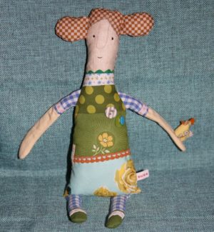 und hier ist noch eine andere version, eine schlenkerpuppe mit hühnchen auf der hand. höhe: 35cm, preis: 36 euro (plus porto)