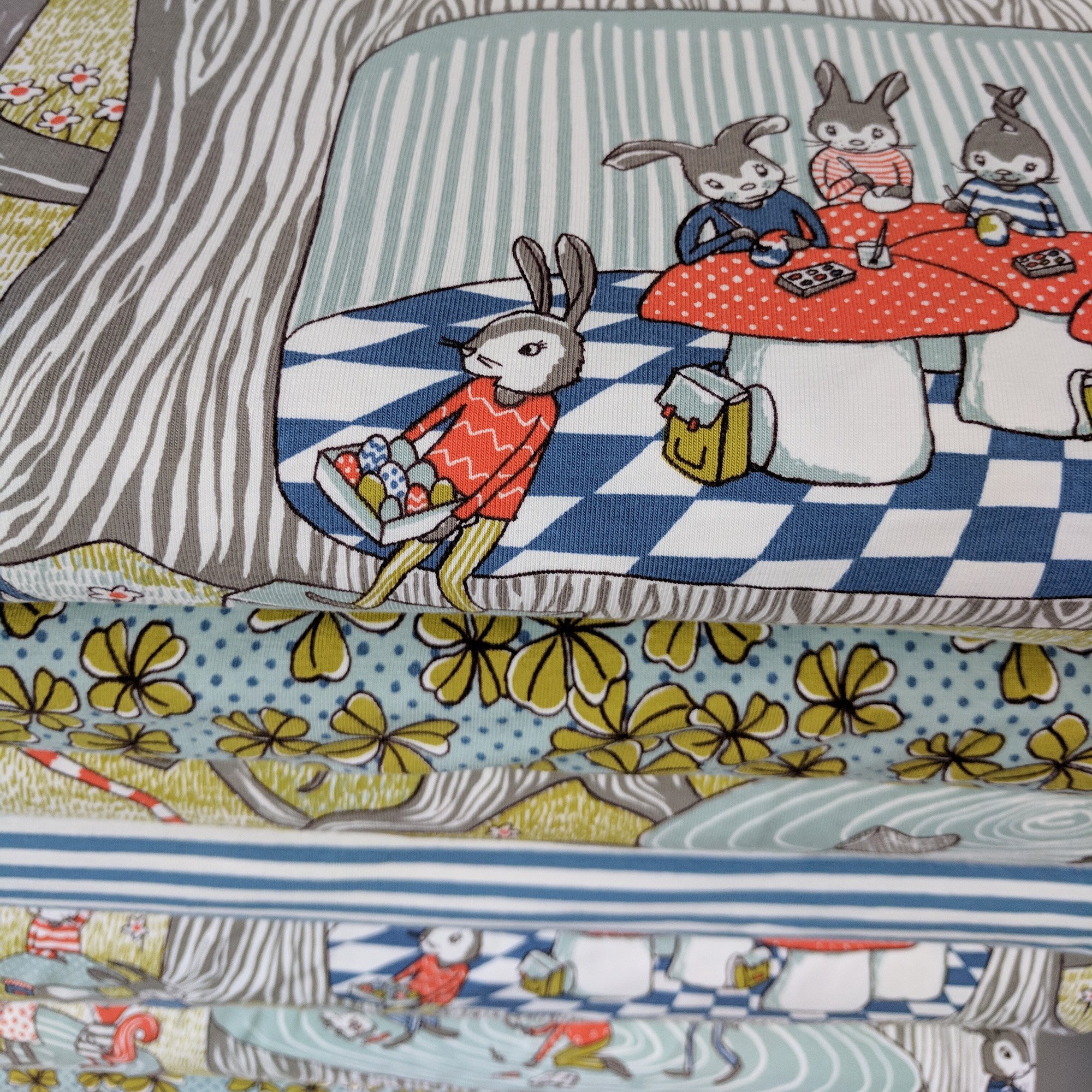 „Hasenschule“ ist ein typischer SUSAlabim-Wimmelbildstoff, mit vielen kleinen Szenen, die Geschichtchen erzählen… er passt natürlich toll zu Ostern, aber Hasengeschichten sind doch auch im Rest des Jahres toll. Wie wäre es mal mit einer Kuscheldecke, die abends zum Einschlafen Geschichten erzählt?