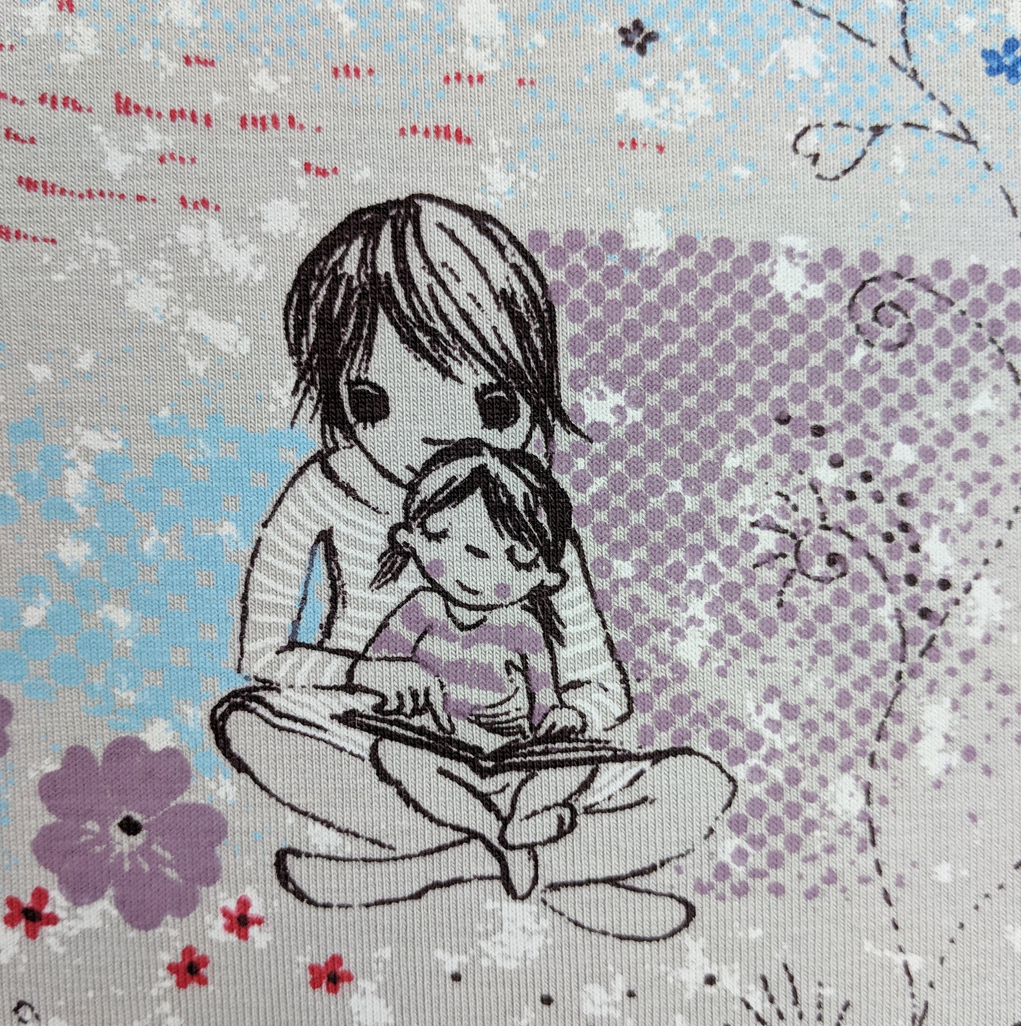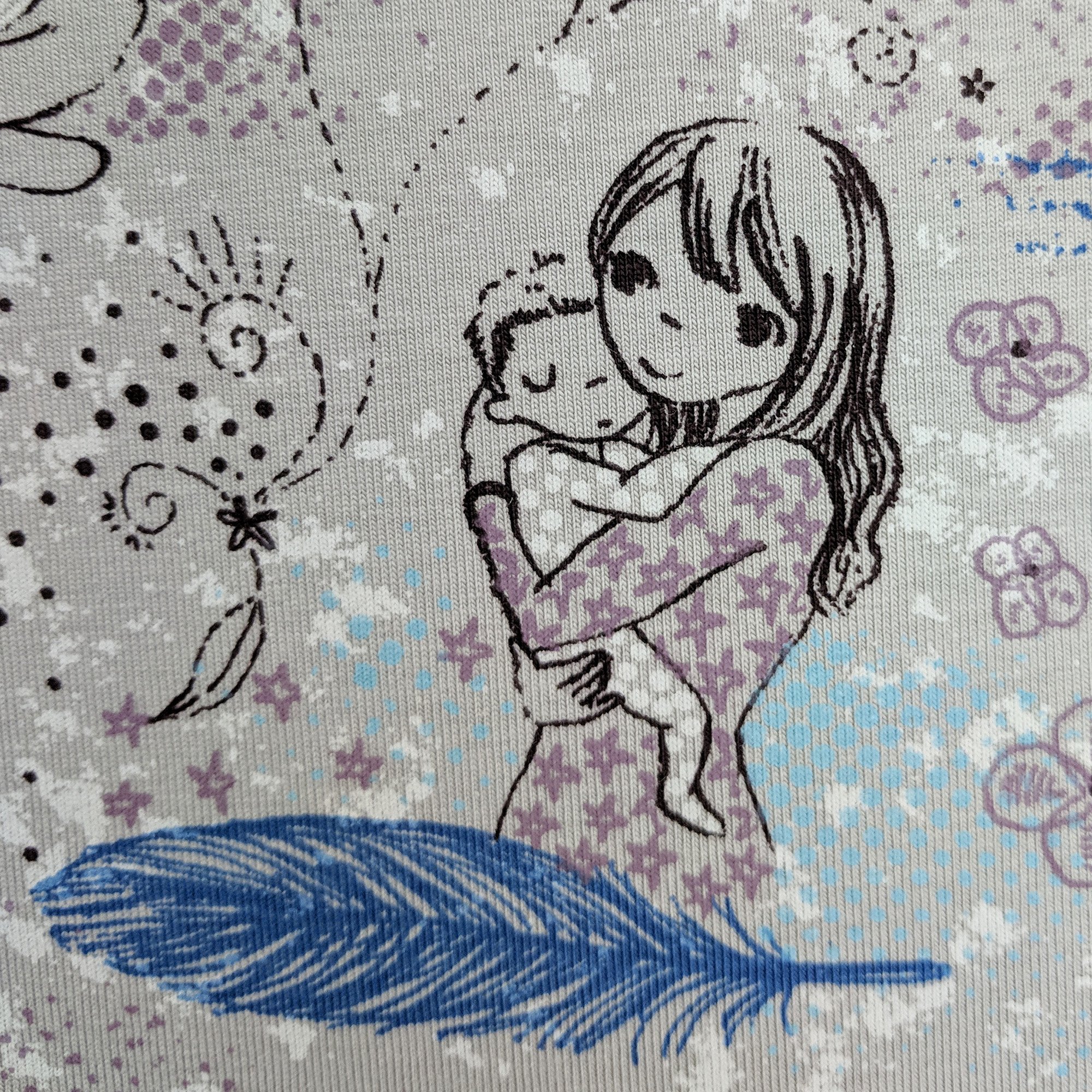 „Kinderliebe“ ist ein Jersey (95% Biobaumwolle, 5% Elasthan). Ich habe einen ziemlich großen Vorrat für den Shop gekauft, der Stoff ist bei mir erhältlich!