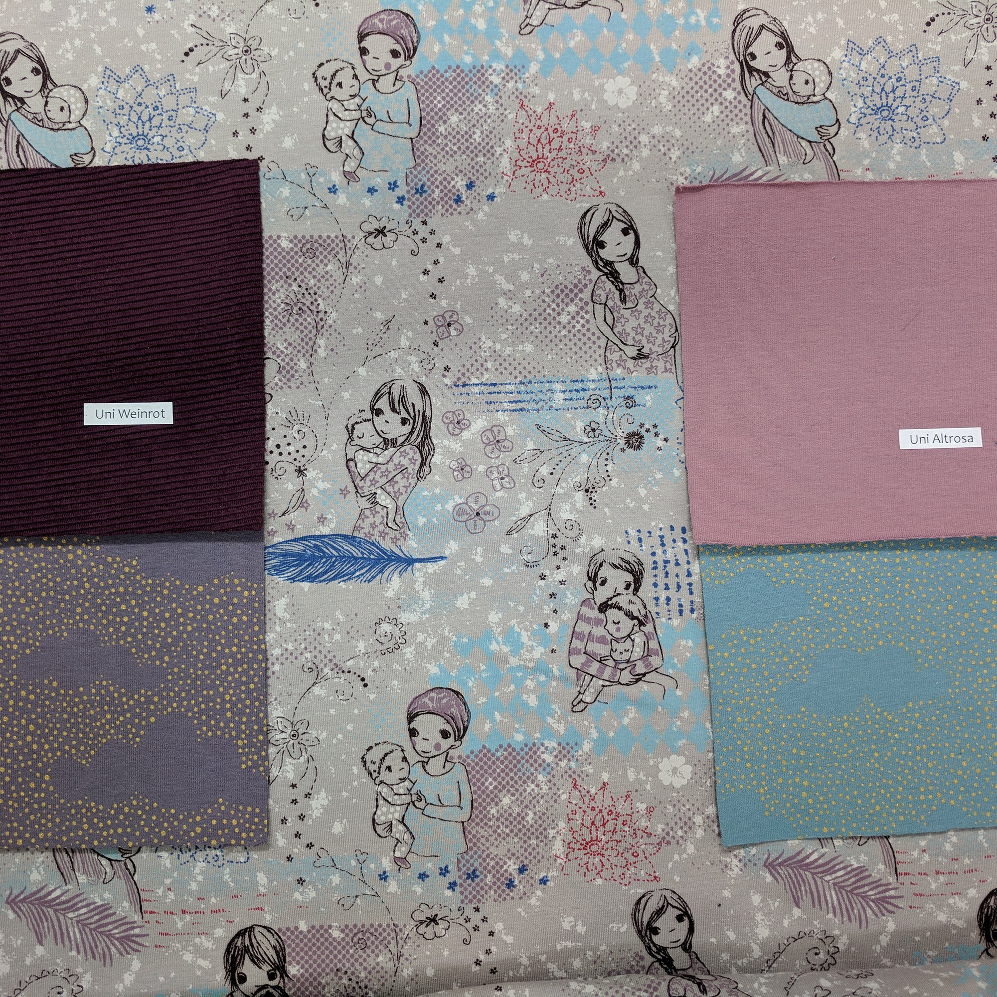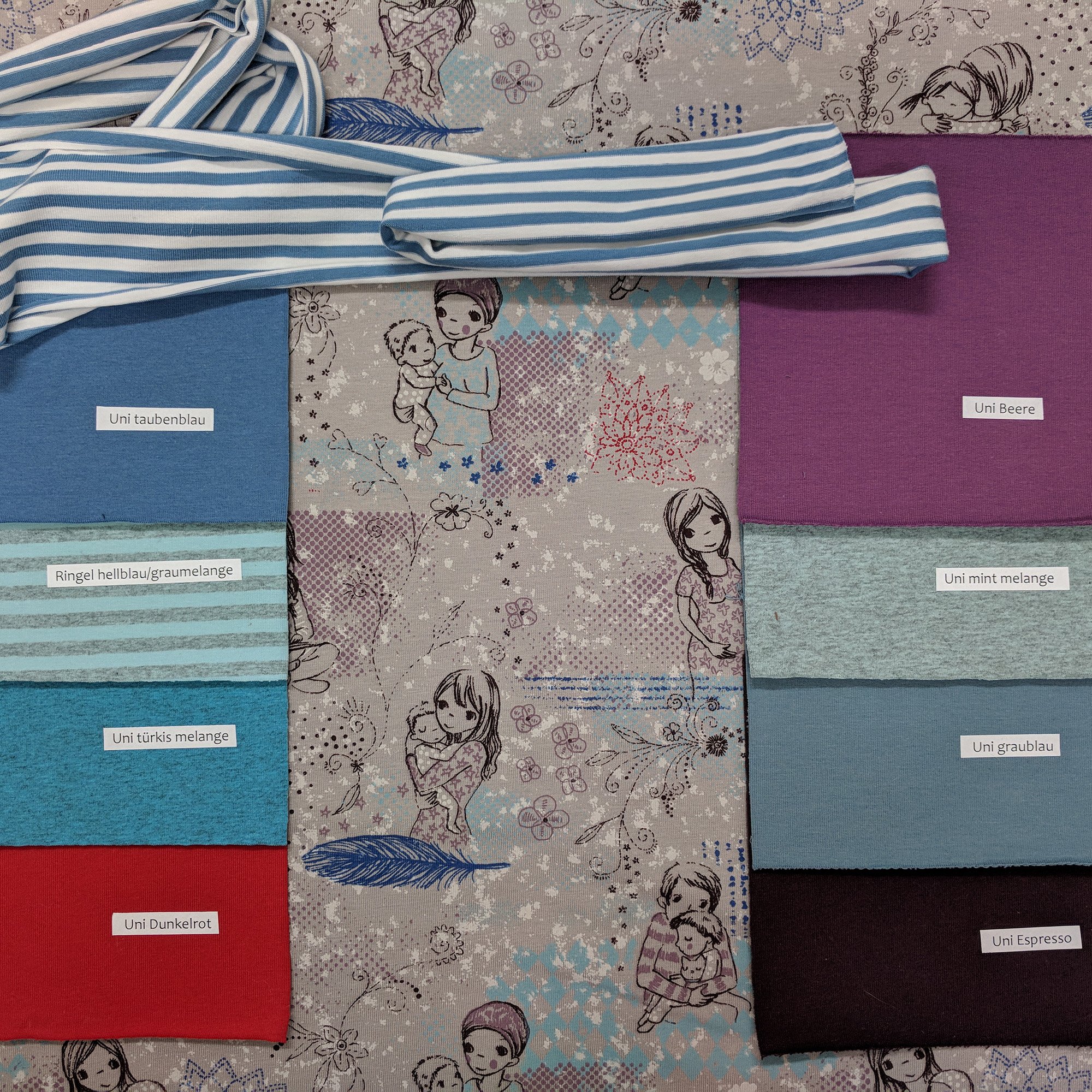 Ich habe euch wieder ein paar passende Kombistoffe ausgesucht, neben verschiedenen Unifarben passen auch z.B. „Ringel hasenblau“ und die „Pünktchenwolken“ in graulila und graublau.