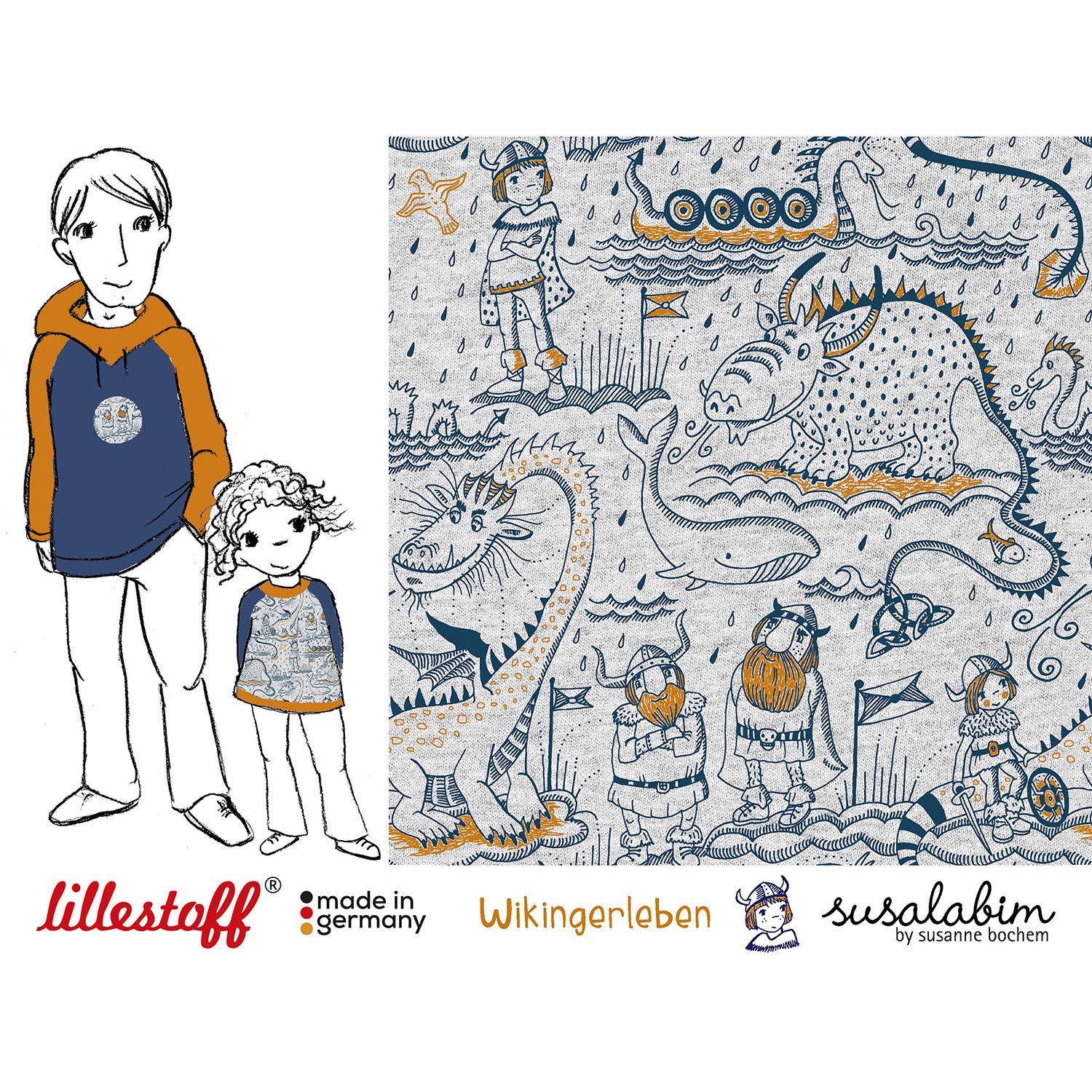 „Wikingerleben“: ein SUSAlabim-Klassiker, den ihr euch immer wieder gewünscht habt… diesmal in neuen Farben! Die Wikinger werden auf graumeliertem Jersey gedruckt (95% Bio-Baumwolle, 5% Elasthan) und aus dem gelb habe ich mal einen Karamellton gemacht…