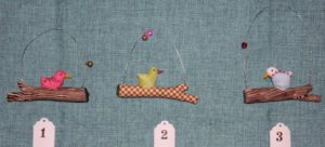 reihe 3: ast mit 2 vögelchen, drahtbügel zum aufhängen. ein vogel ist etwa 3cm hoch, preis: je 13 euro (plus porto)