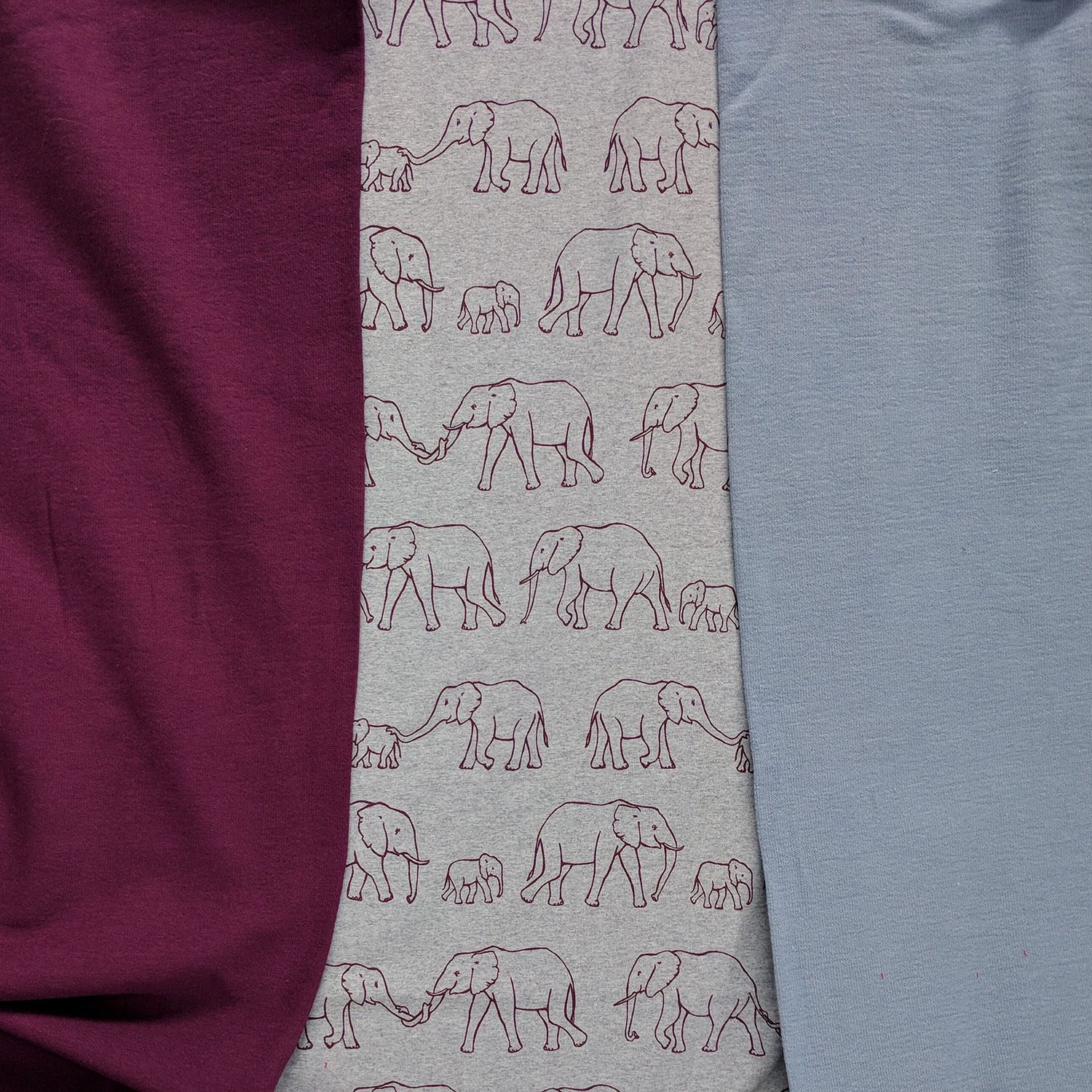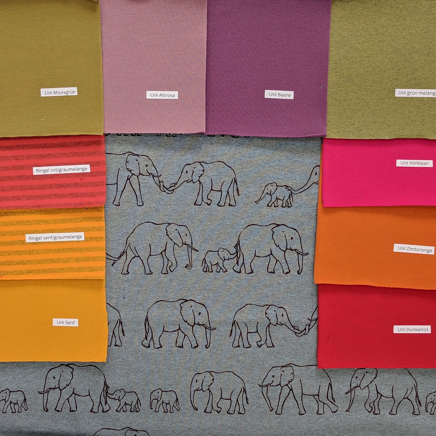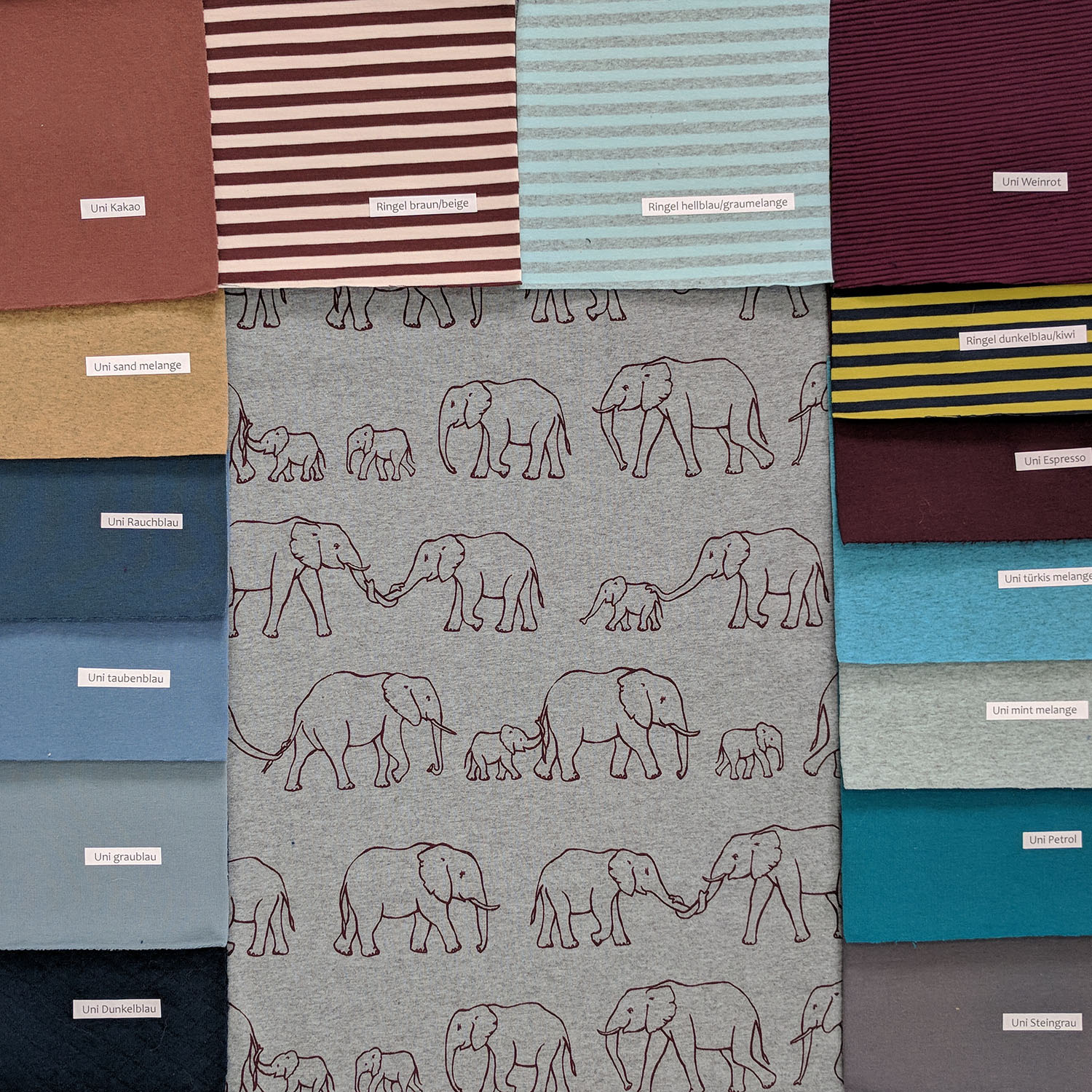 Und wer es lieber nicht so farbig mag, für den gibt es die „Elefantenparade“, gedruckt auf blaugraumeliertem Jersey (95% Bio-Baumwolle, 5% Elasthan, GOTS zertifiziert):
