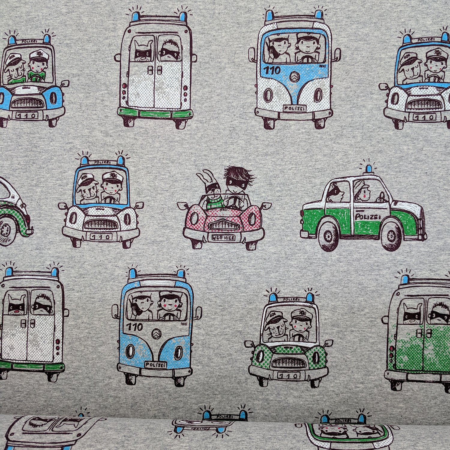 Es ist soweit, die Polizei rückt aus! Ab 18.8.2018 gibt es den Jersey „Tatüüütataaa“! Ähnlich wie der beliebte „Möööp Möööp“ ist er auf graumelierter Bio-Baumwolle gedruckt (95% Bio-Baumwolle, 5% Elasthan).